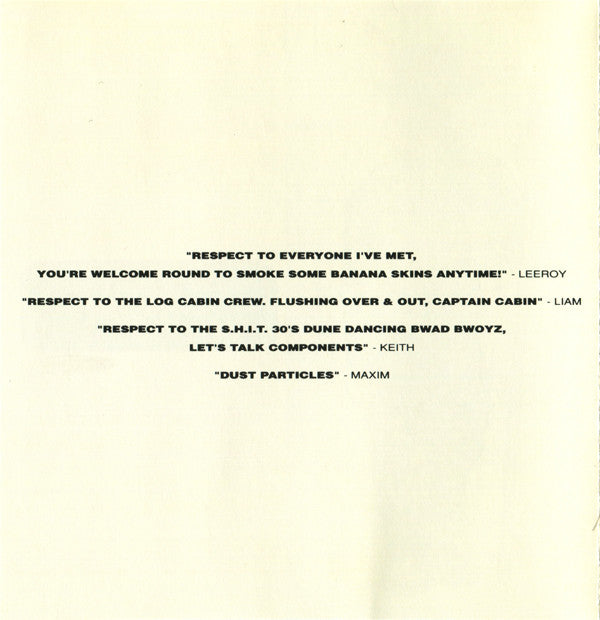 Relese comes with 8-page booklet in roll fold. Original pressing without SID codes. Samples used: Track 01: 'The Batman Is Robbin' by Hijack, 'Keep On Dancing' by Jungle Brothers. Track 02: 'Shout' by Lulu. Track 03: 'Latoya' by Just Ice, 'Live The Life' by The Sindecut. Track 04: 'Shelter Me' by Circuit, 'Made In 2 Minutes' by Bug Kahn & The Plastic Jam (All crew sample), 'The Champ' by Mohawk. Track 05: 'Hello Earth' by Kate Bush (intro) & 'Return of Captain Rock' by Captain Rock. Track 07: 'Chase The Devil' by Max Romeo, 'Critical Beatdown' by Ultramagnetic MC's, 'Homicide' by Shades Of Rhythm. Track 08: 'I'm Riffin' by MC Duke. Track 09: BBC Radio Shipping Forecast & Michael Fish Weather Report. Track 10: 'Fire' by Crazy World Of Athur Brown, 'Hard Times' by Pablo Gad, 'Sweet African Children (Live)' by Aswad. Track 11: 'In The Jungle' by Just Ice, 'Can't Stop' by Plez. "Respect to everyone I've met, you're welcome round to smoke some banana skins anytime!" – Leeroy "Respect to the Log Cabin Crew. Flushing over & out, captain Cabin" – Liam "Respect to the S.H.I.T. 30's dune dancing bwad bwoyz, let's talk components" – Keith "Dust particles" – Maxim All trax were written, produced, engineered and recorded at Earthbound Studios. ℗ 1992 Elektra Entertainment © 1992 XL-Recordings
