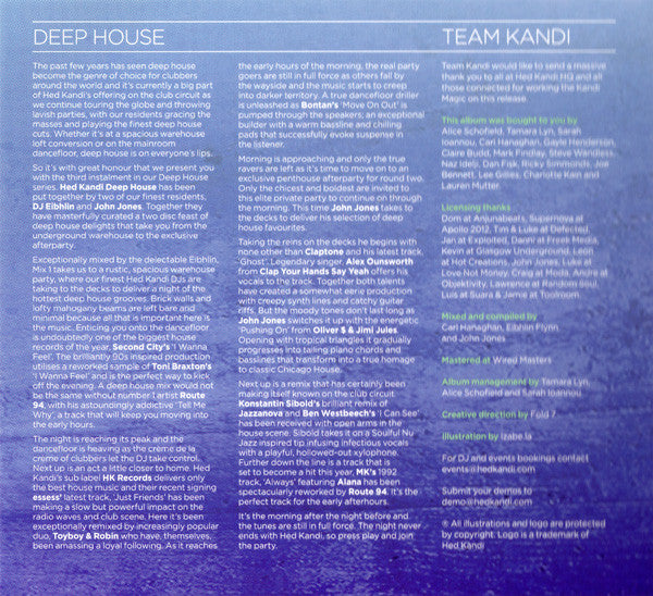"2CDs Of Soulful Deep House Grooves" Title appears on release as: "Hed Kandi presents: Deep House". 1-3 title incorrectly listed as "Tell Me Why". ℗ 2014 Hed Kandi Records. © 2014 Hed Kandi Records. Manufactured in the EU. Distributed in the UK by Sony DADC. Made in the UK.