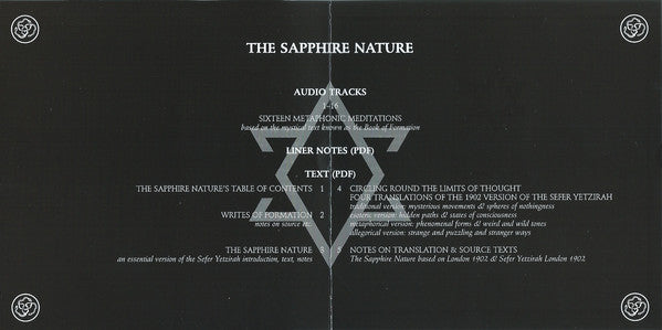 Packaged in standard jewel case, with an obi strip and a 6-panel folded insert that includes credits, notes, and release information. Subtitled: "Sixteen Metaphonic Meditations" based on the mystical text known as the Book of Formation. Enhancement includes PDF files with liner notes and "The Sapphire Nature" text, comprised of four different translations of the same mystical text known as the "Sefer Yetzirah" or the "Book of Formation" Recorded October 15, 2001 - November 22, 2002 [sic. Mastered at Classic Sound, NYC. K2 Technology by JVC Disc America.
