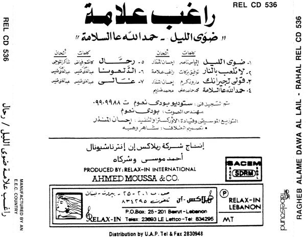 التسجيل والمكساج ستوديو بودي نعوم - بيروت (P) Relax-In Lebanon إنتاج : شركة ريلاكس إن انترناشونال - بيروت لبنان = Produced by: Relax-In Unternational أحمد موسى وشركاه = Ahmed Moussa & Co.