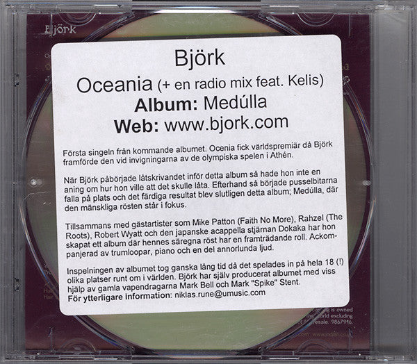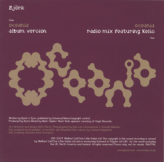 Released in standard clear jewel case with front cover. No back cover inlay. Kelis appears courtesy of /label/108701Virgin Records. Hair sculpture by Hrafnhildur Arnardóttir aka Shoplifter. Track 2 later released as "Oceania (featuring Kelis)" in the /master/36463"Who is it" single. Copies distributed in Finland, Japan and Sweden may come with local promo stickers.