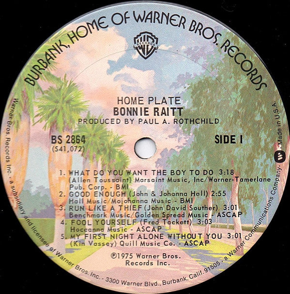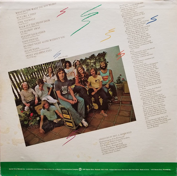 Burbank ("Palmtree") label, Burbank Address appears bottom of label. Recorded at Elektra Sound Recorders, Los Angeles, Summer 1975 Track B5 reads "Your Sweet and Shiny Eyes" on label, but merely "Sweet and Shiny Eyes" on cover. Publishers: A1: Marsaint Music, Inc. / Warner-Tamerlane Pub. Corp. - BMI A2: Hall Music / Mojohanna Music - BMI A3: Benchmark Music / Golden Spread Music - ASCAP A4: Hoceanna Music - ASCAP A5: Quill Music Co. - ASCAP B1: Jewelyard Music - ASCAP B2: Walden Music Inc. - ASCAP / Amnesty Music / Solid Bottom Music - BMI B3: Streetlights Music - ASCAP B4: Glasco Music Co. - ASCAP B5: Dry Clam Music - BMI Track listing on back cover is out of order on this release.