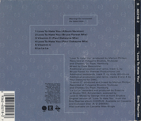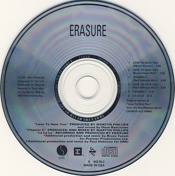 Tracks 1 to 5 recorded at Polygone Studios, Toulouse and Chateau Du Pape, Hamburg. Track 6 recorded and produced at Studio 150, Amsterdam. Published by Musical Moments (Europe) Ltd. / Sonet Publishing Ltd. / Andy Bell Music MCPS ℗ 1991 Sire Records Company. Marketed by Reprise Records, a Time Warner Communications Company. Mfg. by WEA Manufacturing. Digipak case: Made in U.S.A. Disc: Made in USA © 1991 Sire Records Company. Issued in a standard Digipak sleeve with a black disc tray.
