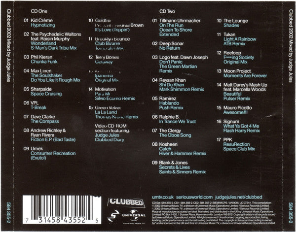 CD1 Also features a Video CD-Rom Section featuring Judge Jules Clubbed Diary. Track 2-6 is actually known as Ralphie B - Massive. Track 2-9 is misspelled as Secrets and Lives instead of Secrets and Lies.