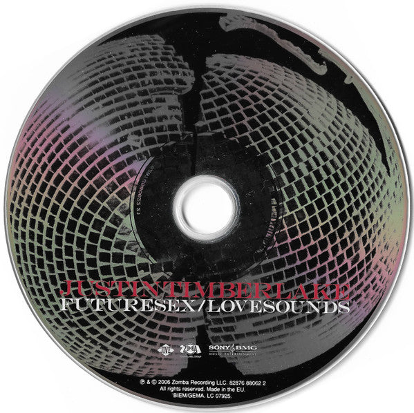 ℗ & © 2006 Zomba Recording LLC Made in the E.U. logo: Jive | Zomba Label Group | Sony BMG Music Entertainment Released in a standard jewel case with clear tray and 28-page booklet. Some copies with hype sticker on front (text in capitals): New Album Futuresex / Lovesounds Includes Sexyback Featuring Timbaland My Love Featuring T.I. What Goes Around... Lovestoned 82876880622
