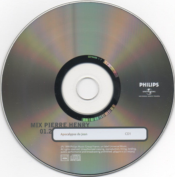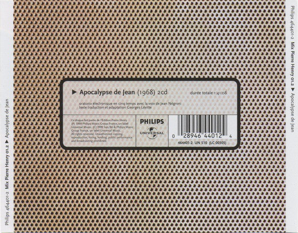 ℗ 1999 Philips Music Group France, un label Universal Music © 1999 Son/Ré & Philips Music Group France, un label Universal Music. Réalisation sonore au Studio Apsome. (P) 1968 Pierre Henry. Création le 30 octobre 1968 au Théâtre de la Musique à Paris lors des 26 heures consacrées à Pierre Henry dans le cadre des Journées de Musique Contemporaine de la Ville de Paris. Commande du Ministère des Affaires Culturelles. This CD belongs to a collection of 17 CDs that were released in 1999-2001 as a retrospective of the electronic music pioneer. Include a 12-page booklet in French. Total playing time: - CD1: 58'17" - CD2: 42'51".