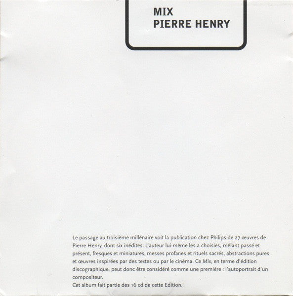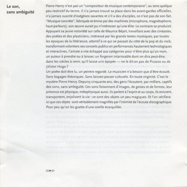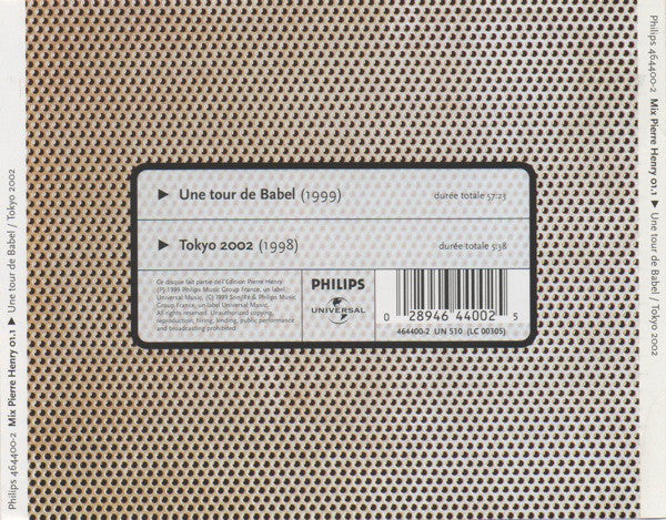 (P) 1999 Philips Music Group France, un label Universal Music (C) 1999 Son/Ré & Philips Music Group France, un label Universal Music. 'Une tour de Babel': Réalisation sonore au studio Son/Ré. (P) 1999 Pierre Henry. Commande spéciale du Ministre de la Culture et de la Communication et de l'INA / GRM à l'occasion du cinquantenaire de la musique concrète. Création salle Olivier Messiaen à Radio France le 7 janvier 1999. 'Tokyo 2002': Réalisation sonore au studio Son/Ré. (P) 1999 Pierre Henry. This CD belongs to a collection of 17 CDs that were released in 1999-2001 as a retrospective of the electronic music pioneer.