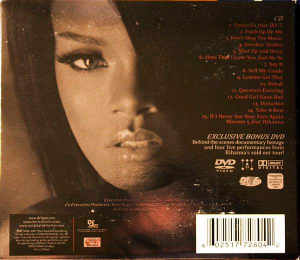 Issued in a gatefold sleeve. "Don't Stop The Music" contains elements of "Wanna Be Startin' Somethin'" written by Michael Jackson, Mijac Music (BMI). All rights administered by Warner-Tamerlane Publishing Corp. (BMI). All rights reserved. Performed by Michael Jackson, courtesy of Sony BMG Entertainment. Used by permission. "Shut Up And Drive" contains elements from "Blue Monday" written by Stephen Morris, Peter Hook, Bernard Sumner and Gillian Gilbert, published by BE Music (ASCAP), administered by Warner-Chappell Music Ltd. (ASCAP). All rights reserved. "Say It" contains sampled elements from the composition "Flex" written by Ewart Brown, Clifton Dillon, Sly Dunbar and Brian Thompson and published by Zomba Enterprises (ASCAP)/Songs of PolyGram International, Inc. All rights reserved. Performed by Mad Cobra, courtesy of Sony BMG Entertainment. Used by permission. Exclusive bonus DVD: Behind-the-scenes documentary footage and four live performances from Rihanna's sold out tour! DVD has Region codes 2-6. Made in the EU.