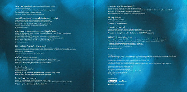 ℗ & © 2003 Arista Records, Inc. Distributed by the local BMG company. All trademarks and logos are protected. Made in the EU. "Why Don't You & I" is the re-recorded single version. The "Smooth" and "Maria Maria" remixes are from their respective single releases. "Mañana" and "Truth Don Die" are from the Why Don't You & I single. "Let Me Love You Tonight" is from the international version of Shaman, replacing "Since Supernatural" from the North American version. "Curación" is a collaboration with Paul Schwartz from his State of Grace II album and also from [r=2248169 single. "Come to My World" is from the The Game of Love single.