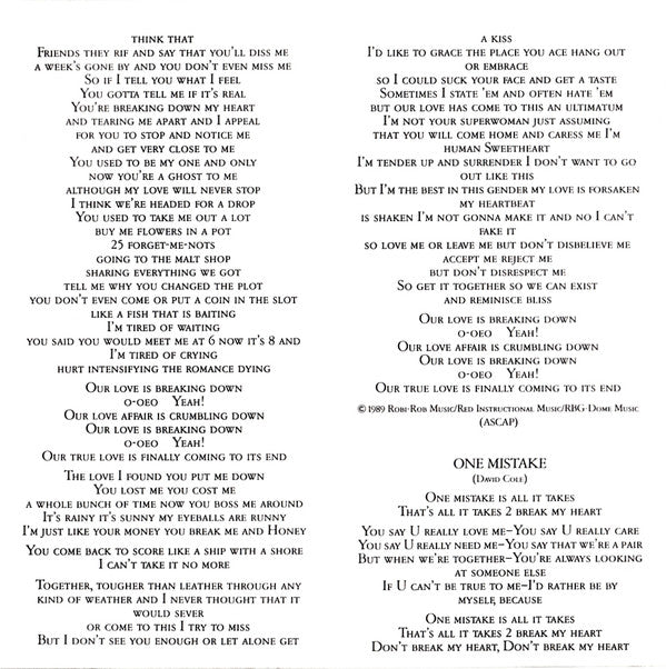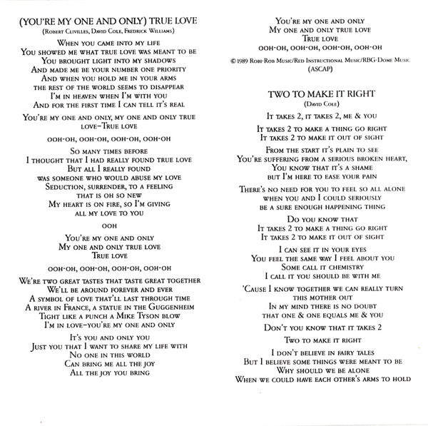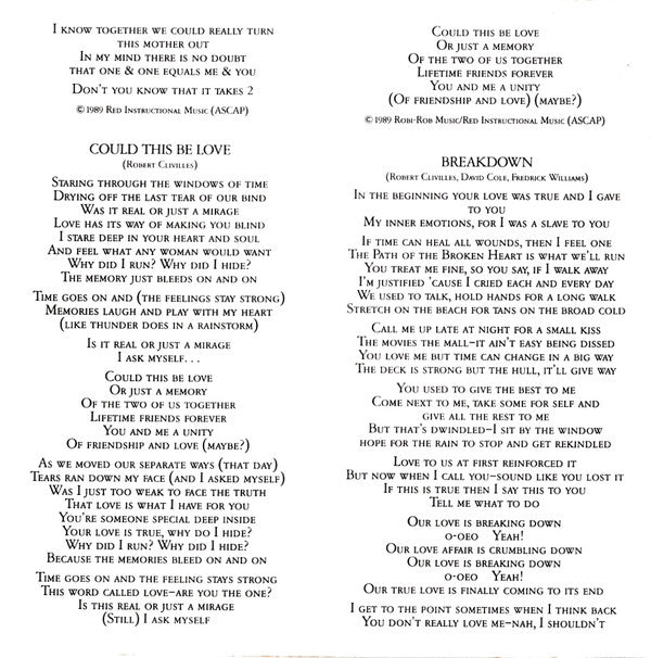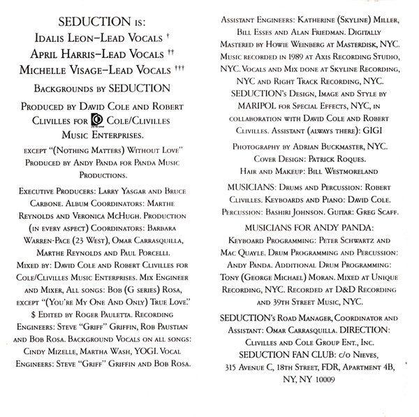 ℗&© 1989 A&M Records, Inc.; All Rights Reserved; Printed in the U.S.A.; A&M Records, Inc., P.O. Box 118, Hollywood, CA 90078; SPARS Code: AAD; Tracks 1-7, 9, 10: Produced for Cole/Clivilles Enterprises; Track 8: Produced for Panda Music Productions, Mixed at Unique Recording, NYC, Recorded at D&D Recording and 39th Street Music, NYC; Mixed for Cole/Clivilles Music Enterprises; Digitally Mastered at Masterdisk, NYC; Music Recorded in 1989 at Axis Recording Studio, NYC; Vocals and Mix done at Skyline Recording, NYC and Right Track Recording, NYC; Aeduction's Design, Image and Style by MARIPOL for Special Effects, NYC; Photography by Adrian Buckmaster, NYC; Direction: Clivilles and Cole Group Ent., Inc.; Seduction Fan Club: c/o Nieves, 315 Avenue C, 18th Street, FDR, Apartment 4B, NY, NY 10009; Tracks 1 & 4: © 1989 Robi-Rob Music/Red Instructional Music/RBG-Dome Music (ASCAP); Tracks 2,5,6: © 1989 Red Instructional Music (ASCAP); Track 3,9,10: © 1989 Robi-Rob Music/Red Instructional Music (ASCAP); Track 7: © 1981 Sugarbiscuit Music Publishing, Inc. (ASCAP); Track 8: © 1989 Andy Panda Music/Zomba Enterprises (ASCAP); All Lyrics Used By Permission; All Rights Reserved; Unauthorized Reproduction Prohibited; "From: SEDUCTION and the producers, A very special thanks to the following: The staff of Vendetta Records: Larry Yasgbar, Bruce Carbone, Paul Porcelli, Veronica McHugh and Marthe Reynolds. A&M Records, especially Gil Friesen, Tom Corson, Steve Ralbovsky, Charlie Minor, Rick Stone, Jesus Garber, Mark Mazzetti, Jeff Gold, Angie Brooks, Faye Evans, Manny Lehman, Chris Wasmunc, Sandy Brummels and Nancy Cwikla, FREDRICK WILLIAMS, WILLIE MELENDEZ, Eddie Rivera and the RPBC Staff, Judy Weinstein and for the Record Record Pool DJ's, David Morales, Hosh Gureli and Keith Naftaly, Steve Ellis, Kevin McCabe and Joel Salkowitz, Giselle Nieves, The Cover Girls, Sal Abbatiello of Fever Enterprises, Andy Panda, Sandee, Bruce Garfield and The Garfield Group; The 23 West Staff (Bob Gordon, Steve Rosen, Craig Rosen, Jim Grove and Barbara Warren-Pace), Skyline Recording Studio and STaff, Unique Recording Studio and Staff, Albert and the Downtown Records Crew, Rock & Soul Records, Vinylmania, Junior Vasquez, Christina Visca and The Sound Factory Staff, Bruce Lundvall, Scott Folks, Carol Cooper (The baddest manager on the planet), Maripol and GIGI from Special Effects, Craig Kostich, Bob Rosa (The Tyson Engineer), Steve "Griff" Griffin, The Clivilles Family (all 13,000 of them); The Cole Family, and finally, Jonathan Blank and his staff."