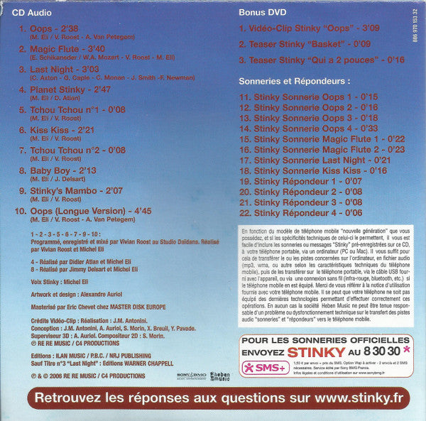 En fonction du modèle de téléphone mobile "nouvelle génération" que vous possédez, et si les spécificités techniques de celui-ci le permittent, il vous est facile d'inclure les sonneries ou messages "Stinky" pré-enregistrées sur ce CD, à votre téléphone portable, via un ordinateur (PC ou Mac). Il vous suffit pour cela de transférer le ou les pistes concernées sur l'ordinateur, en fichier audio (mp3, wma, ou autre selon les caractéristiques techniques du téléphone mobile), puis de les transférer sur le téléphone portable, via le câble USB fourni avec l'appareil, ou via une connexion sans fil (infra-rouge, bluetooth, etc.) si le téléphone mobile en est équipé. Merci de vous référer à la notice d'utilisation fournie avec votre téléphone mobile. Il se peut que votre téléphone ne soit pas équipé des dernières technologies permettant d'effectuer correctement ces opérations. En aucun cas la société Heben Music ne peut être tenue responsable d'un problème ou dysfonctionnement technique sur le transfert des pistes audio "sonneries" et "répondeurs" vers le téléphone mobile.