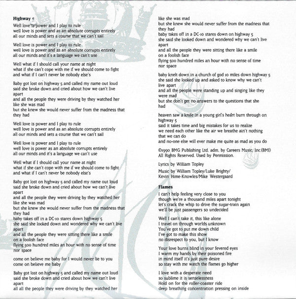 Recorded at Air Studios, London, England Mixed at Skyline Studios, New York, NY, Mayfair Studios, London, England and Skip Saylor Recording, Hollywood, CA ℗©1991 MCA Records, Inc. Distributed by Uni Distribution Corp. All songs published by BMG Publishing Ltd. adm. by Careers Music, Inc. (BMI) except: Track 2 also published by Checkerman Music and Careers Music, Inc. (BMI) 12 page front booklet - vertically oriented.