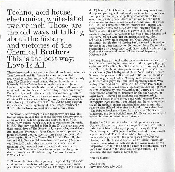 Track 2-9 recorded live at the Roxy, NYC, November 1996. Track 2-11 recorded live at Brixton Academy, December 1997. Track 1-3 contains a sample from Blake Baxter's 'Brothers Gonna Work It Out'. Track 1-5 contains a sample from 'Gucci Again', as performed by Schooly D. Track 1-7 contains a sample from the recording 'The Roof Is On Fire' by Rockmaster Scott and The Dynamic Three. Track 1-11 contains part of the improvisation performed by C. Niemen in the recording 'Pielgrzym', originally released on the LP '228419' (1974). ℗ & © 2003 Virgin Records Limited © 2003 EMI Records Limited Made and printed in the E.U. Includes a 16 page booklet. Front sticker on first copies: "Features the hits Block Rockin' Beats, Hey Boy Hey Girl, Setting Sun, Star Guitar and the new single The Golden Path. Also includes exclusive 11 track bonus disc. 724359282923 Copy controlled See reverse for details . Details siehe Rückseite Voir au verso pour détails . Dettagli sul retro Más información en la contraportada" Tracks 2-1, 2-2, 2-4, 2-9 and 2-10 are previously unreleased. The individual discs have catalog numbers: CD1: 724359282923 / 724359283029 CD2: 724359282923 / 724359283128