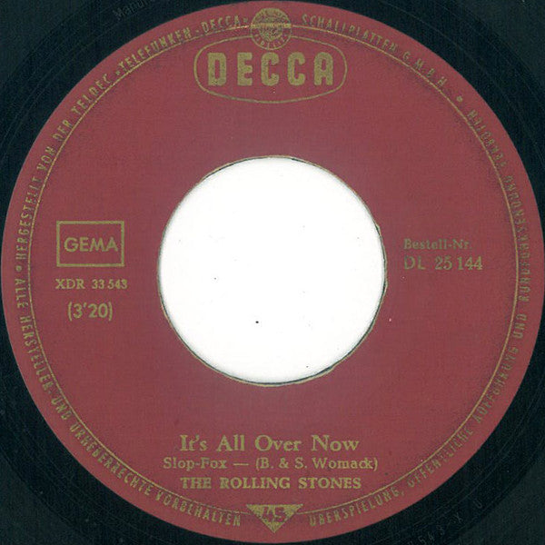 In collector's circles, the picture sleeve is referred to as ''5-Köpfe Cover'' (5-heads cover). Wine-red labels with gold lettering. The Decca logo is in an oval and located at 12 o'clock on the label. A: Slop-Fox B: Foxtrott