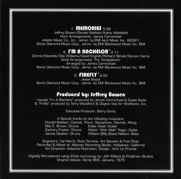 (p)1975 Motown Record Company (c)1998 Motown Record Company, a PolyGram company LC 0881 Digitally Remastered using 24-bit technology at PolyGram Studios Original release: Gordy 969, January, 1975