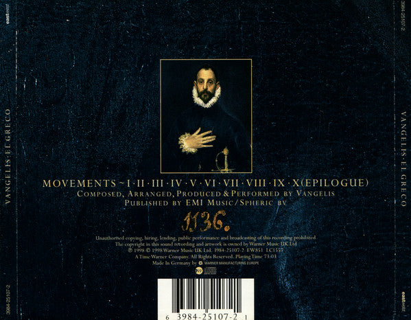 Issued in a standard clear jewel case with six page foldout booklet. Total time: 73:03 — On/in booklet: A tribute to El Greco Special thanks to my colleagues who contributed to the completion of this work: Frederick Rousseau, Philippe Colonna, Yvan Cassar, John Martin, Andrew Hoy, Ian Lane & Rob Dickins. 'El Caballero De La Mano El Pecho' by El Greco. Copyright c Museo Del Prado, Madrid. [... — On back: All tracks published by EMI Music / Spheric BV. The copyright in this sound recording and artwork is owned by Warner Music UK Ltd. ℗ 1998 © 1998 Warner Music UK Ltd. A Time Warner Company. All rights reserved. Made in Germany by Warner Manufacturing Europe.