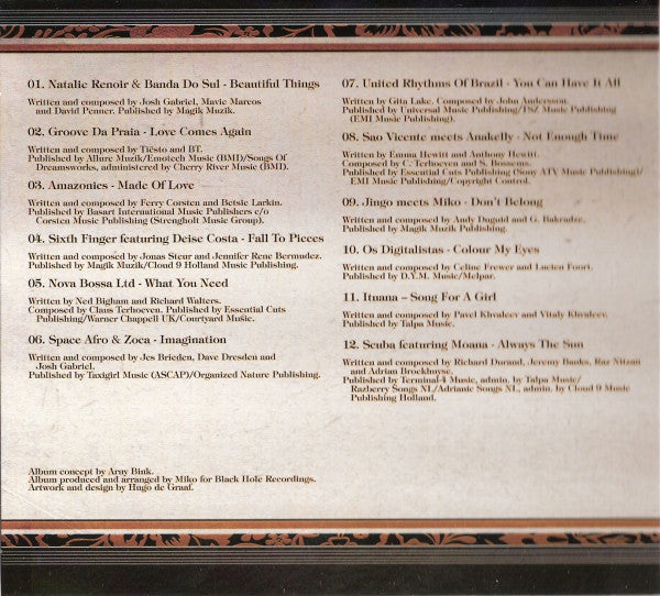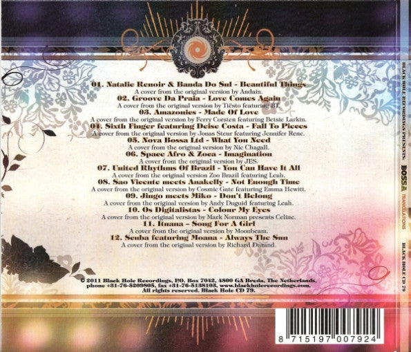 Full title is: Black Hole Recordings presents: Bossa Trancelations. Album produced and arranged for Black Hole Recordings. 1 A cover from the original version by Andain. 2 A cover from the original version by Tiësto featuring BT. 3 A cover from the original version by Ferry Corsten featuring Betsie Larkin. 4 A cover from the original version by Jonas Steur featuring Jennifer Rene. 5 A cover from the original version by Nic Chagall. 6 A cover from the original version by JES. 7 A cover from the original version by Zoo Brazil featuring Leah. 8 A cover from the original version by Cosmic Gate featuring Emma Hewitt. 9 A cover from the original version by Andy Duguid featuring Leah. 10 A cover from the original version by Mark Norman presents Celine. 11 A cover from the original version by Moonbeam. 12 A cover from the original version by Richard Durand. 1 Published by Magik Muzik. 2 Published by Allure Muzik/Emotech Music (BMI)/Songs Of Dreamworks, administered by Cherry River Music (BMI). 3 Published by Basart International Music Publishers c/o Corsten Music Publishing (Strengholt Music Group). 4 Published by Magik Muzik/Cloud 9 Holland Music Publishing. 5 Published by Essential Cuts Publishing/Warner Chappell UK/Courtyard Music. 6 Published by Taxigirl Music (ASCAP)/Organized Nature Publishing. 7 Published by Universal Music Publishing/TSZ Music Publishing (EMI Music Publishing). 8 Published by Essential Cuts Publishing (Sony ATV Music Publishing/EMI Music Publishing /Copyright Control). 9 Published by Magik Muzik Publishing. 10 Published by D.Y.M. Music/Melpar. 11 Published by Talpa Music. 12 Published by Terminal-4 Music, admin. by Talpa Music/Razberry Songs NL/Adrianic Songs NL, admin. by Cloud 9 Music Publishing Holland. © 2011 Black Hole Recordings (sleeve) © 2010 Black Hole Recordings (disc) Durations from WMP.