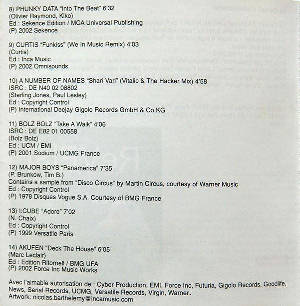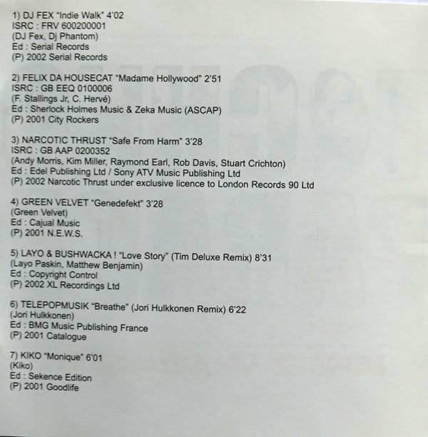 Duration on sleeve is wrong. Corrected as above. 3: Contains uncredited sample of 'I Got My Mind Made Up' performed by Instant Funk. 5: Contains uncredited samples of 'Rags And Old Iron' performed by Nina Simone, 'Mongoloid' performed by Devo, and 'Yellow Brick Road' performed by Captain Beefheart and His Magic Band. 6: Writing credit wrongly attributed to Jori Hulkkonen. 8: Exclusive to this compilation. 12: Contains samples of 'Disco Circus' performed by Martin Circus.