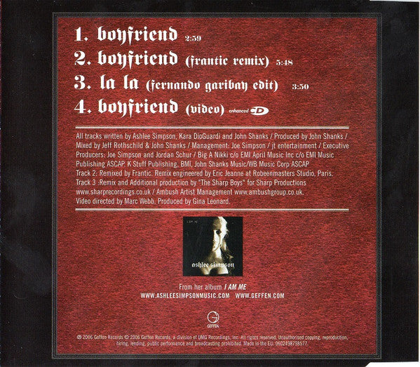 Printed on cover: Publisher: Big A Nikki c/o EMI April Music Inc c/o EMI Music Publishing ASCAP. K Stuff Publishing, BMI, John Shanks Music/WB Music Corp ASCAP Track 2: Remix engineered at Robeenmasters Studio, Paris. Track 3: Remix and additional production for Sharp Productions www.sharprecordings.co.uk / Ambush Artist Management www.ambushgroup.co.uk ℗ 2006 Geffen Records © 2006 Geffen Records, a division of UMC Recordings, Inc. Made in the EU From her album: I Am Me www.ashleesimpsonmusic.com www.geffen.com Printed on CD: ℗ 2006 Geffen Records © 2006 Geffen Records, a division of UMC Recordings, Inc. Made in the EU www.ashleesimpsonmusic.com www.geffen.com