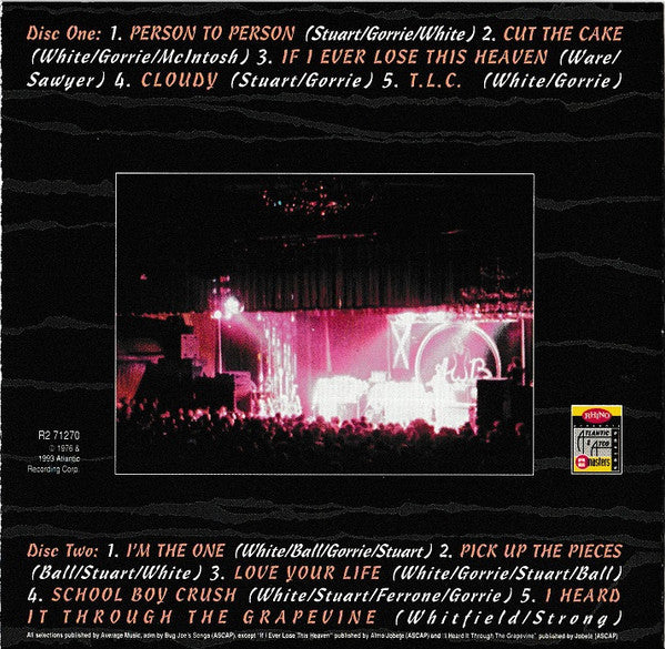 Originally released as 2-LP in 1976 [Atlantic SD 2 1002 Recorded live at Tower Theatre & The Spectrum, Philadelphia, PA, and The Syria Mosque, Pittsburgh, PA, & The Coliseum, Cleveland, OH. Tracks published : 1-1, 1-2 and 1-4 to 2-4 Average Music, adm by Bug / Joe's Songs ( ASCAP ) 1-3 Almo / Jobete ( ASCAP ) According to Discogs Jobete is affiliated to BMI 2-5 Jobete ( ASCAP )