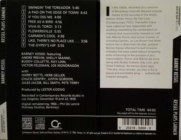 Music adapted by Barney Kessel from the score of Carmen by Georges Bizet. (c) 1959 by Composers Music-ASCAP All arrangements by Barney Kessel. Recorded in Contemporary Studio in Los Angeles, December 19th and 22nd, 1958. Similar to but different barcode and different back cover.