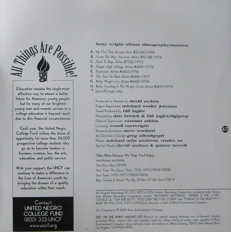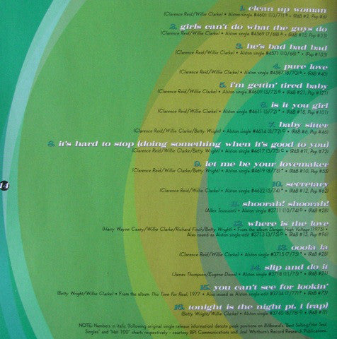 Artwork with 15 page booklet of biographical and discography notes. All Original Recordings Ⓟ 1972, 1973 & 1974 Atlantic Recording Corporation, produced under license from Atlantic Recording Corporation, except "Shoorah! Shoorah", "Where Is The Love", "Ooola La", "Slip And Do It", "You Can't See For Looking" and "Tonight Is The Night Pt. 1 (Rap)" Ⓟ 1974, 1975, 1977 & 1978 Alston Records, a label of Rhino Entertainment Company. This Compilation Ⓟ 2000 Rhino Entertainment Company Made in Germany
