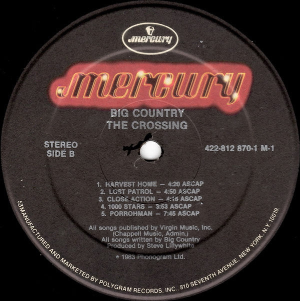 "53" printed on labels and "↔" and "HRM" etched in runouts indicate pressing by [l277410. Recorded at The Manor and RAK Studios, May 1983. Printed in U.S.A. ℗ © 1983 Phonogram Ltd. © 1983 by Virgin Music (Publishers) Ltd. and Big Country Music Published in the U.S.A. by Virgin Music, Inc. (Chappell Music, Admin.) (ASCAP) Management for Grant-Edwards Management Issued in textured jacket with no barcode. Includes printed inner sleeve with lyrics, artwork and credits. Cat. # 812 870–1 M–1 appears on jacket, inner sleeve. Cat. # 422-812 870-1 M-1 appears on labels. Also available on cassette (812 870–4 M–1) In runouts, "HW" is etched beneath MASTERDISK stamp. Remainder of runouts is etched.