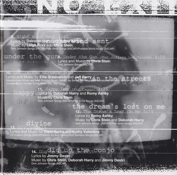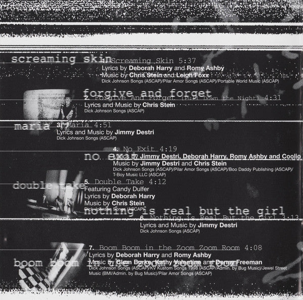Issued with a 10-page booklet. Printed on backcover: © 1999 Beyond Music/ ℗ 1998 Beyond Music. Beyond Music and Beyond Music logo are trademarks of LeftBank Records, Inc. Distributed by the local BMG Company. A unit of BMG Entertainment. Made in the EU. Printed on booklet: Publisher: Track 1: Dick Johnson Songs (ASCAP)/Pilar Amor Songs (ASCAP)/Portable World Music (ASCAP) Track 2: Dick Johnson Songs (ASCAP) Track 3: Dick Johnson Songs (ASCAP) Track 4: Dick Johnson Songs (ASCAP)/Pilar Amor Songs (ASCAP)/Boo Daddy Publishing (ASCAP)/T-Boy Music LLC (ASCAP) Track 5: Dick Johnson Songs (ASCAP) Track 6: Dick Johnson Songs (ASCAP) Track 7: Dick Johnson Songs (ASCAP)/KV Kustom Songs 1998 (ASCAP/admin. by Bug Music)/Jewel Street Music (BMI/admin. by Bug Music)/Pilar Amor Songs (ASCAP) Track 8: Dick Johnson Songs (ASCAP)/Pilar Amor Songs (ASCAP)/Portable World Music (ASCAP) Track 9: Dick Johnson Songs (ASCAP) Track 10: Steeplechase Music and Malt Shoppe Music, admin. by Songs of Polygram International, Inc./Trio Music Company, Inc /Tender Tunes Music Co., Inc. Track 11: Dick Johnson Songs (ASCAP)/Pilar Amor Songs (ASCAP) Track 12: Dick Johnson Songs (ASCAP)/Pilar Amor Songs (ASCAP) Track 13: KV Kustom Songs (ASCAP/ admin. by Bug Music)/Dick Johnson Songs (ASCAP) Track 14: Dick Johnson Songs (ASCAP) Recorded at: Red Night Recording NYC, Electric Lady Studios, NYC and Chung Hung King House of Metal NYC Mixed at: Abbey Road Studios, London. Encore Studios, Los Angeles Mastered at Future Disc, Los Angeles "No Exit" special guest artist Coolio appears courtesy of Tommy Box Records. Candy Dulfer appears courtesy of N2K Encoded Music (North America) and BMG Music (International) Chris Stein would like to thank Benjamin, Shadrack, Gee, Batierce and Taelo, Tom Leiber, Forat Electronics, Eye and I Products and E-Bow Inc. Clem Burke would like to thank Premier Drums, Zildjian Inc. and Vic Firth Inc. Hilly Chrystal, Kathy Valentine, Ellen Sanderson, Matt O'Connor, Vincent Denunzio and Arty Smith. Jimmy Destri would like to thank Kurzweil Keyboards, Eilleen, Eilleen Tara and little Jimmy Destri. Blondie would like to thank Steve Cirona, Harry Sandler and Tommy Hilfinger. Leigh Foxx would like to thank Kathy Miller, Donnie, Joxce and the gang at 608 6th. Paul would like to thank Randall Sharp and Johnny Reinhold. www.blondie.net © 1999 Beyond Music/ ℗ 1998 Beyond Music. Beyond Music and Beyond Music logo are trademarks of LeftBank Records, Inc. Made in the EU. Printed on CD: © 1999 Beyond Music/ ℗ 1998 Beyond Music. Beyond Music and Beyond Music logo are trademarks of LeftBank Records, Inc. Distributed by the local BMG Company. A unit of BMG Music. Made in the EU.