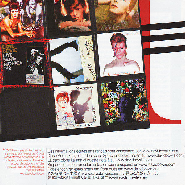From insert under tray: © 2008 David Bowie. ℗ 2008 The copyright in this compilation is owned by EMI Records Ltd. © 2008 Jones/Tintoretto Entertainment Co. LLC. © 2008 EMI Records Ltd. On CD: Made in the EU.