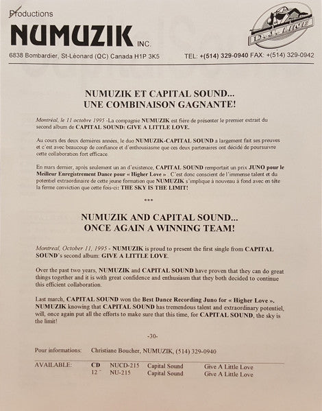 ℗ 1995 Capital Sound Productions © 1995 Numuzik Productions Inc There were two different company jackets for this same release (see images). Some copies handed out to DJs included a 3-page Bio sheet (see image).