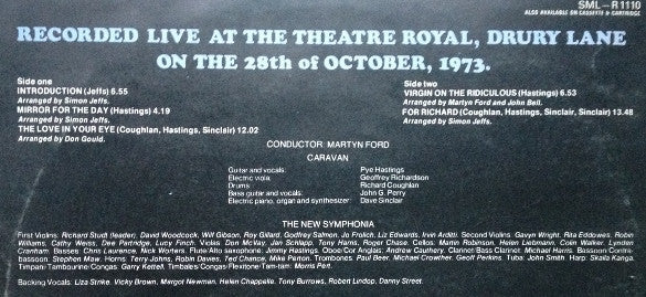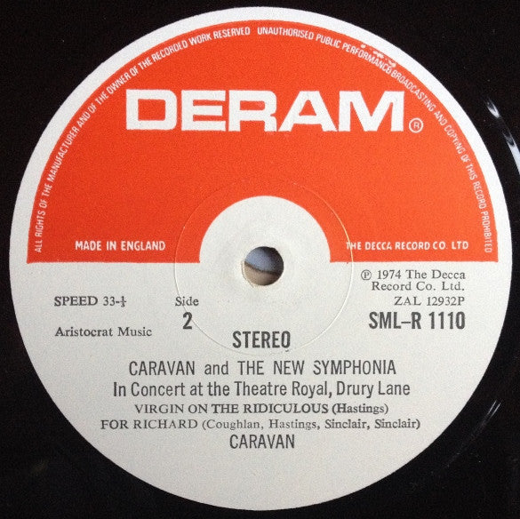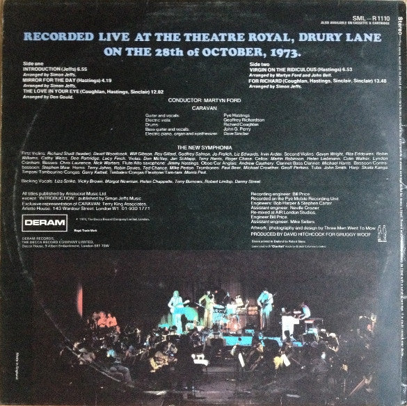Released on a red and white Deram label in a front laminated sleeve. Recorded live at The Theatre Royal, Drury Lane on the 28th of October, 1973. Recorded on the Pye Mobile Recording Unit. Re-mixed at AIR London Studios. Exclusive representation of CARAVAN: Terry King Associates. Arlette House, 143 Wardour Street, London W1. 01-930 1771 All titles published by Aristocrat Music Ltd. except "Introduction" published by Simon Jeffs Music. Track A1 "Introduction" ; Publisher accredited to Simon Jeffs Music on the sleeve, on the label it is accredited to Chrysalis Music. ℗ 1974 The Decca Record Co. Ltd. P 1974, The Decca Record Company Limited , London. Sleeve printed in England by Robert Stace. Laminated with 'Clarifoil' made by British Celanese Limited.