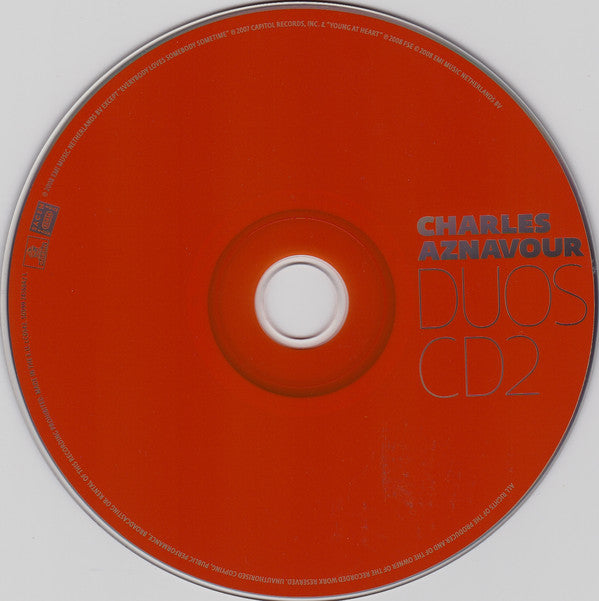 Comes with a 20-page booklet. "Music from EMI" on spine, 'Odeon' logo on the back cover. On back cover: Made in the E.U. ℗ 2008 EMI Music Netherlands BV except "Everybody Loves Somebody Sometime" ℗ 2007 Capitol Records, Inc. & "Young At Heart" ℗ 2008 FSE © 2008 EMI Music Netherlands BV. Inside booklet: 1-1: Éditions Musicales Djanik, recorded at Shire Studios (New York, USA), mixed at Studio Le Chalet (Bois-Colombes, France), Céline Dion appears courtesy of Sony BMG Music (Canada), Inc. 1-2: Éditions Musicales Djanik, recorded in Miami (USA), mixed at Studio Le Chalet (Bois-Colombes, France), Julio Iglesias appears courtesy of Sony BMG Music Entertainment (Netherlands) BV 1-3: Éditions Musicales Djanik, recorded at Palau De Les Arts Reina Valencia (Spain), mixed at Studio Le Chalet (Bois-Colombes, France) 1-4: Éditions Musicales Djanik, recorded at Guillaume Tell Studios (Suresnes, France) & Oliveta Recording Studios (Castelbolognese, Italy), mixed at Atlantic Seven Studios (London, UK), Laura Pausini appears courtesy of Warner Music Italy 1-5: Éditions Musicales Djanik, recorded at Guillaume Tell Studios (Suresnes, France) & Silent Sound Studios (Atlanta, USA), mixed at Atlantic Seven Studios (London, UK), Elton John appears courtesy of Mercury Records Ltd. 1-6: Éditions Musicales Djanik, recorded in 2004 at Guillaume Tell Studios (Suresnes, France) courtesy of Universal Music France, mixed at Studio Le Chalet (Bois-Colombes, France), Johnny Hallyday appears courtesy of Warner Music France 1-7: Éditions Musicales Djanik, recorded at Guillaume Tell Studios (Suresnes, France), mixed at Studio Le Chalet (Bois-Colombes, France), Nana Mouskouri appears courtesy of Mercury, a division of Universal Music France 1-8: Éditions Musicales Djanik, recorded at Lake House Studios (Salisbury Wiltshire, UK) & Studio Guillaume Tell (Suresnes, France), mixed at Studio Le Chalet (Bois-Colombes, France), Sting appears courtesy of Cherrytree/A&M Records 1-9: Éditions Musicales Djanik, recorded at Guillaume Tell Studios (Suresnes, France), Josh Groban appears courtesy of Warner Bros Records, Inc. 1-10: Éditions Musicales Djanik, recorded at Right Track Recording Studios (New York, USA), mixed au Studio Le Chalet (Bois-Colombes, France), Carole King appears courtesy of Rockingale Records 1-11: Éditions Musicales Djanik, recorded at Capitol Studios (Los Angeles, USA), mixed at Studio Le Chalet (Bois-Colombes, France), Paul Anka appears courtesy of Paul Anka Productions 1-12: Éditions Musicales Djanik, recorded at Hansa Tonstudios (Berlin, Germany) & at Studio La Buissonne (Pernes-les-Fontaines, France), mixed at Studio Le Chalet (Bois-Colombes, France), Herbert Grönemeyer appears courtesy of EMI Music Germany GmbH & Co. KG 1-13: Éditions Raoul Breton, recorded at Guillaume Tell Studios (Suresnes, France), mixed at Studio Le Chalet (Bois-Colombes, France) 2-1: Éditions Musicales Djanik, recorded at Guillaume Tell Studios (Suresnes, France) & Silent Sound Studios (Atlanta, USA), mixed at Atlantic Seven Studios (London, UK), Elton John appears courtesy of Mercury Records Ltd. 2-2: Éditions Musicales Djanik, recorded at Right Track Recording Studios (New York, USA), mixed at Studio Le Chalet (Bois-Colombes, France) 2-3: Éditions Musicales Djanik, recorded at Lake House Studios (Salisbury Wiltshire, UK) & Studio Guillaume Tell (Suresnes, France), mixed at Studio Le Chalet (Bois-Colombes, France), Sting appears courtesy of Cherrytree/A&M Records 2-4: Éditions Cherio Corporation BMI / June's Tunes US ℗ 2008 Frank Sinatra Enterprises, LLC, original recording from the album "<a href="/master/144098">Sinatra's Sinatra</a>", mixed at Studio Le Chalet (Bois-Colombes), with courtesy of FSE 2-5: Éditions Musicales Djanik, recorded at Guillaume Tell Studios (Suresnes, France), mixed at Studio Le Chalet (Bois-Colombes, France), Nana Mouskouri appears courtesy of Mercury, a division of Universal Music France 2-6: Éditions Musicales Djanik for France SACEM territories / Standard Music for the rest of the world, mixed at Studio Le Chalet (Bois-Colombes), Bryan Ferry appears courtesy of EMI Records Limited. 2-7: Éditions Musicales Djanik, recorded at Capitol Studios (Los Angeles, USA), mixed at Studio Le Chalet (Bois-Colombes, France), Paul Anka appears courtesy of Paul Anka Productions 2-8: Éditions Art Music France / Éditions Musicales Djanik, recorded at Shire Studios (New York, USA), mixed at Studio Le Chalet (Bois-Colombes, France), Céline Dion appears courtesy of Sony BMG Music (Canada), Inc. 2-9: Éditions Musicales Djanik, recorded at Guillaume Tell Studio (Suresnes), Josh Groban appears courtesy of Warner Bros Records, Inc. 2-10: Éditions Musicales Djanik, recorded at "Palau De Les Arts Reina Valencia" (Spain), mixed at Studio Le Chalet (Bois-Colombes, France) 2-11: Éditions Musicales Djanik, recorded at Right Track Recording Studios (New York, USA), mixed au Studio Le Chalet (Bois-Colombes, France), Carole King appears courtesy of Rockingale Records 2-12: Éditions Musicales Djanik, recorded in 2004 at Guillaume Tell Studios (Suresnes, France) courtesy of Universal Music France, mixed at Studio Le Chalet (Bois-Colombes, France), Johnny Hallyday appears courtesy of Warner Music France 2-13: Éditions Musicales Djanik, recorded at Guillaume Tell Studios (Suresnes, France) & Oliveta Recording Studios (Castelbolognese, Italy), mixed at Atlantic Seven Studios (London, UK), Laura Pausini appears courtesy of Warner Music Italy 2-14: Éditions Musicales Djanik, recorded at Hansa Tonstudios (Berlin, Germany) & at Studio La Buissonne (Pernes-les-Fontaines, France), mixed at Studio Le Chalet (Bois-Colombes, France), Herbert Grönemeyer appears courtesy of EMI Music Germany GmbH & Co. KG 2-15: Éditions Sands Music Corp. ℗ 2007 Capitol Records Inc, Charles Aznavour's vocals recorded at Studio Guillaume Tell (Suresnes, France), Dean Martin appears courtesy of Capitol Records Masterisé au studio