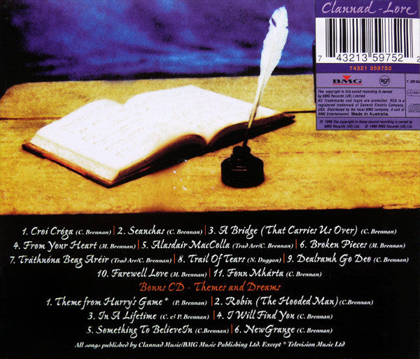 Track 2-5 is printed as "Something To BelieveIn". Track 2-6 is printed as "NewGrange" and on the original album release the track was printed as "Newgrange". Alister MacMillan is credited as engineer for track 1-10 twice instead of track 1-11. Recorded at Windmill Lane & The Greenhouse Mixed at Battery Studios All songs published by Clannad Music/BMG Music Publishing Ltd. Except 2-1 Television Music Ltd Track 2-1: ℗1982. Track 2-2: ℗1984. Track 2-3: ℗1985. Track 2-4: ℗1993. Track 2-5: ℗1987. Track 2-6: ℗1983. ℗ 1996 The copyright in these sound recording is owned by BMG Records (UK) Ltd. © 1996 BMG Records (UK) Ltd. Manufactured for and distributed by BMG Australia Ltd. A unit of BMG Entertainment. Made under license. Made in Australia.