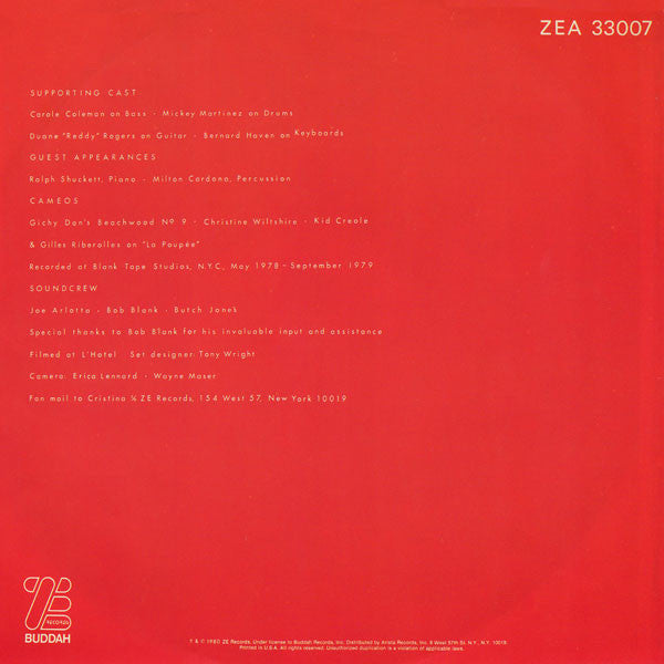 Recorded at Blank Tape Studios, N.Y.C., May 1978-September 1979. ℗ & © 1980 ZE Records, Inc., under license to Buddah Records, Inc. Distributed by Arista Records, Inc. Printed in U.S.A.