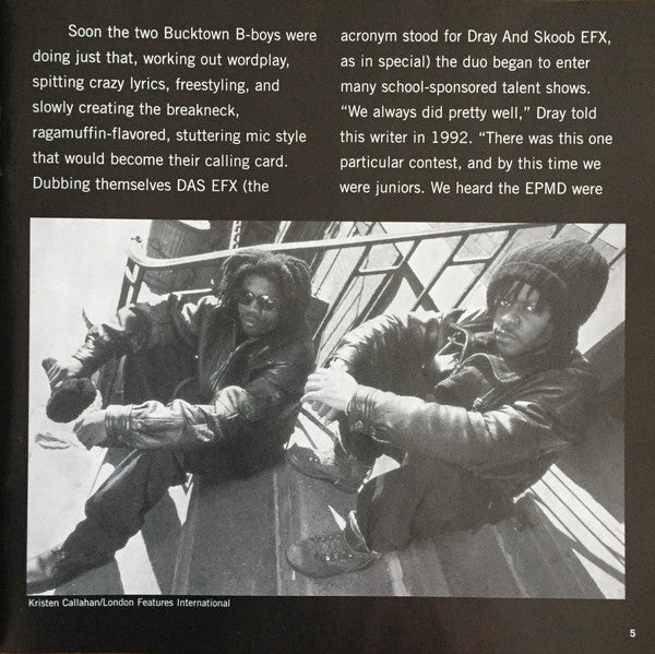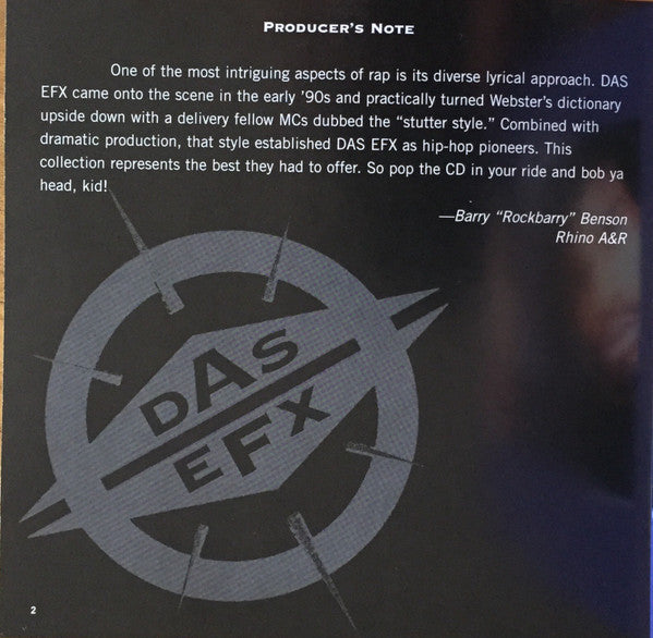 Lyric reprint: "They Want EFX" (Andre Weston/Willie Hines/J. Brown/F. Wesley/C. Bobbit) © 1992, EMI April Music, Inc. Sewer Slang Music, Cellar To The Addict, Dijon Music. All rights for Sewer Slang Music & Cellar To The Addict controlled and administered by EMI April Music Inc. (ASCAP). All rights for Dijon Music Publishing by Universal-Songs of Polygram International Inc. (BMI). Contains elements of "Blind Men Can See It" by J. Brown/F. Wesley/C. Bobbit Track 1 Recorded at North Shore Soundworks, Commack, NY From the album 97432 Tracks 2 to 4, 6, 7 Recorded at Firehouse Studios, New York, NY From the album 97432 Track 5 Recorded at North Shore Soundworks, Commack, NY Contains elements from "The Man With The Sad Face" by Stanley Turrentine, courtesy of Fantasy, Inc. From the album 97432 Tracks 8, 9 Recorded & mixed at North Shore Soundworks, Commack, NY From the album 97443 Track 10 Recorded & mixed at North Shore Soundworks, Commack, NY Contains elements from "Paul Revere" by the Beastie Boys, courtesy of Sony Music Entertainment From the album 97443 Track 11 Recorded & mixed at D&D Studios, New York, NY From the album 97444 Track 12 Recorded & mixed at Green Street Studios, New York, NY From the album 97444 Track 13 Recorded at Ian London Studios, East Islip, NY Mixed at Music Palace, Long Island, NY From the album 97444 Track 14 Recorded & mixed at Chung King Studios, New York, NY From the album 97444 Track 15 Recorded at Music Palace, Long Island, NY Mixed at North Shore Soundworks, Commack, NY From the album 97451 Track 16 Recorded at North Shore Soundworks, Commack, NY & Rock'n Reel Studio, New York, NY Mixed at North Shore Soundworks, Commack, NY Contains elements from "Dazz" by Brick, courtesy of Sony Music Entertainment From the album 97451 Remastering at Digiprep Back cover: Original recordings ℗ 1992, 1993, 1995 & 1998 Elektra Entertainment Group. This compilation ℗ & © 2001 Elektra Entertainment Group & Rhino Entertainment Company. Made in Germany by Warner Music Manufacturing Europe. CD face: Original recordings ℗ 1992, 1993, 1995 & 1998 Elektra Entertainment Group. This compilation ℗ 2001 Elektra Entertainment Group & Rhino Entertainment Company. Made in Germany. Booklet: © 2001 Elektra Entertainment Group & Rhino Entertainment Company