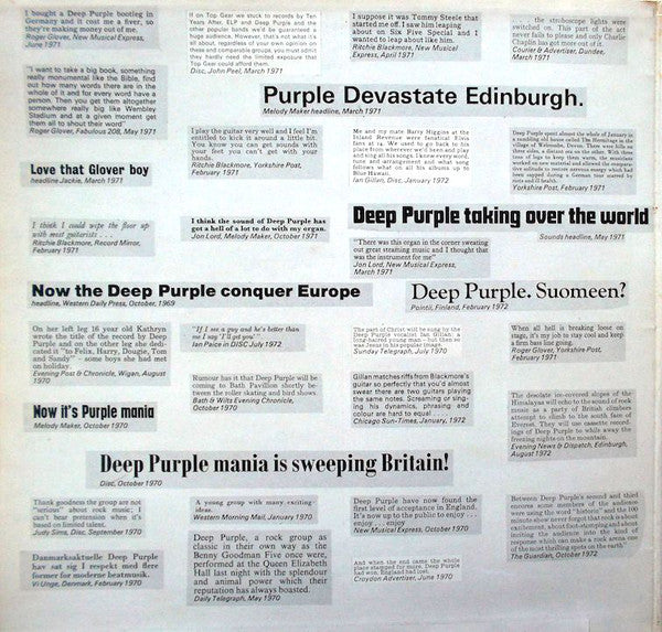 1st UK issue. Outer laminated gatefold sleeve with a purple single sided lyric sheet. Labels: 'The Gramophone Co. Ltd' text on top outer perimeter edge & 'Made in Gt. Britain' at 6 o'clock. ℗ 1973 Deep Purple (Overseas Ltd.) Sleeve: 7302 TPS (February 1973) on inner gatefold. Made and printed in Great Britain Printed and made by Garrod and Lofthouse Ltd. Lyric insert: ©1972 Feldman / Hec Music Ltd. Reprinted by permission All rights reserved G & L Ltd.