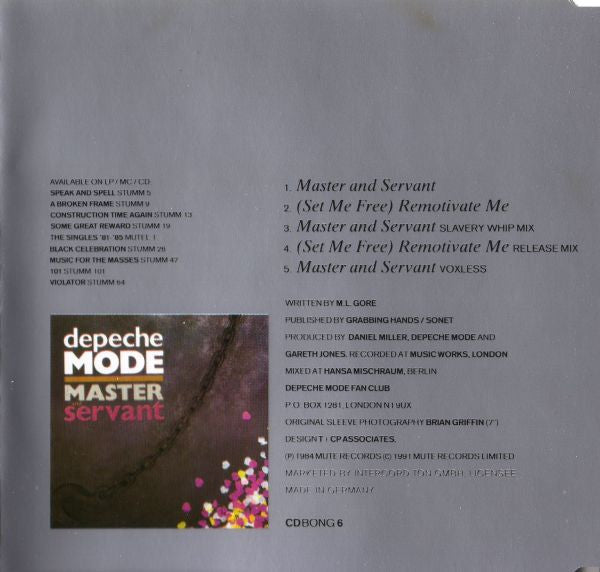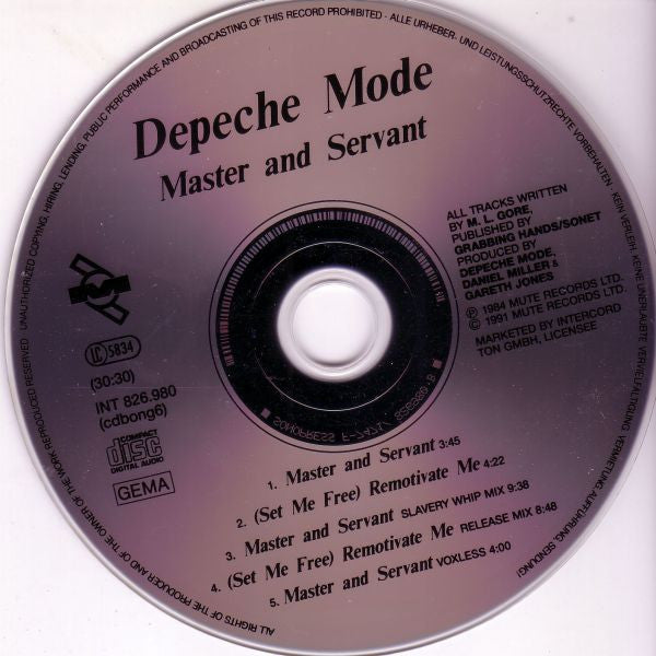 Recorded at Music Works, London. Mixed at Hansa Mischraum, Berlin. ℗ 1984 Mute Records © 1991 Mute Records Limited Marketed by Intercord Ton GmbH, Licensee Made In Germany "Master And Servant" (Bong 6) Released August 20th 1984 From The Album "Some Great Reward" German editions of this release: 1. 1991, clear CD center, barcode 4 006758 269801 2. 1996 reissue with mould SID code, mirror CD center, barcode 7 24347 21912 2 (this one) 3. Repress, clear CD center, barcode 4 006758 269801, with mould SID code