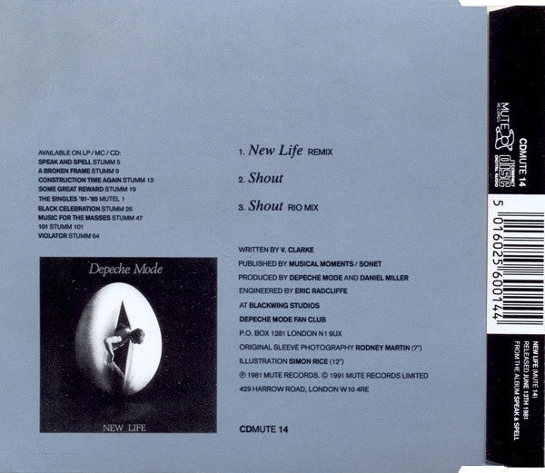 Published by Musical Moments / Sonet ℗ 1981 Mute Records © 1991 Mute Records Limited New Life (Mute 14) released June 13th 1981 From the album Speak & Spell Packaging: j-card case. Released also as a part of Singles Box Set 1-6 (DMBX 1) UK/Europe CD releases with identical catalogue number: 1. Glass mastered at DADC Austria (this one) 2. Glass mastered at DADC Austria, repress with SID code 3. Glass mastered at Nimbus 4. Glass mastered at Technicolor 5. Glass mastered at EMI Uden, only Mute logo on sleeve & disc 6. Glass mastered at EMI Uden, Mute / Virgin / Labels logos on sleeve & disc