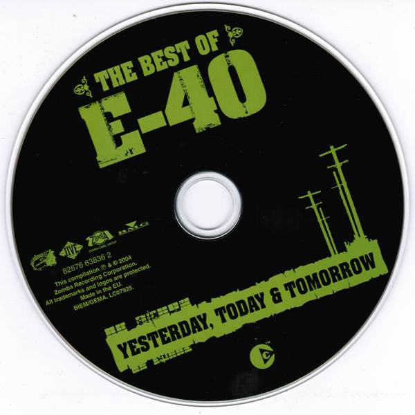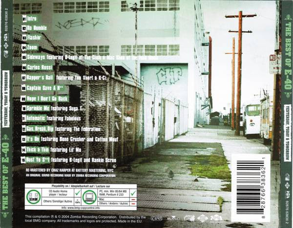 Track 2 Zomba Songs Inc./E-40 Music Publishing (adm. by Zomba Songs Inc.)/Sam & Mike Music (BMI) Produced for Mob Boss Productions Track 3 Zomba Songs Inc./E-Forty Music Publishing/Toneonly Publishing (both adm. by Zomba Songs Inc.) (BMI) Produced for Tone Only Productions Track 4 Jobete Music Co., Inc. o/b/o itself and Libren Music and Cambrae Music (ASCAP) Track 5 Zomba Songs Inc./E-40 Music Publishing/B-Legit Publishing (both adm. by Zomba Songs Inc.) (BMI)/Crooked Funk Music (ASCAP) Produced for Crooked Funk Productions B-Legit and Mac Shon appear courtesy of Sick Wid It Records Track 6 Zomba Songs Inc./E-40 Music Publishing/Tone Only (both adm. by Zomba Songs Inc.) (BMI) Track 7 Zomba Songs Inc./E-Forty Music Publishing/Srand Music (both adm. by Zomba Songs Inc.) (BMI)/Zomba Enterprises Inc./Badass Music (adm. by Zomba Enterprises Inc.)/LBN Music Publishing (ASCAP) Produced for Badass Productions K-Ci appears courtesy of Geffen Records Contains portions of the composition of "Playboy $hort" written by T. Shaw, courtesy of 75 Girls Music (BMI) under license from Jas-el Music Track 8 Zomba Songs Inc./E-Forty Music Publishing Co. (adm. by Zomba Songs Inc) (BMI) Track 9 Zomba Songs Inc./E-Forty Music Publishing (adm. by Zomba Songs Inc.) (BMI)/Zomba Enterprises Inc./Badass Productions (adm. by Zomba Enterprises Inc.)/EMI April Music Inc./Big Boovah Music (ASCAP) Produced for Badass Productions Contains a portion of the composition "Sun Goddess", written by M. White and J. Lind, published by EMI April Music Inc./Big Boovah Music (ASCAP) Track 10 Zomba Songs Inc./E-40 Music Publishing/Suga T Publishing (both adm. by Zomba Songs Inc.)/Sam & Mike Music (BMI) Produced for Mob Boss Productions Track 11 Zomba Songs Inc./E-Forty Music Publishing (adm. by Zomba Songs Inc.) (BMI)/EMI April Music, Inc. o/b/o itself and Cyphercleff Music/D.Brasco Music (ASCAP)/Desert Storm (BMI)/Jobete Music Co. Inc. (ASCAP)/Stone Diamond Music Corp. (BMI)/Warner-Tamerlane Publishing Corp. o/b/o itself and Mijac Music (BMI) Produced for Sharick & Mook, Inc. Fabolous appears courtesy of Desert Storm/Atlantic Recording Corporation Contains a portion of the composition "Dancing Machine", written by Harold E. Davis, Donald E. Fletcher, Weldon D. Parks, published by Jobete Music Co. Inc. (ASCAP)/Stone Diamond Music Corp. (BMI)/Also contains a portion of the composition "For The Love Of Money", written by Kenneth Gamble, Leon Huff and Anthony Jackson, published by Warner-Tamerlane Publishing Corp. o/b/o itself and Mijac Music (BMI) Track 12 E-Forty Music Publishing (BMI)/EMI April Music, Inc. o/b/o itself and Cyphercleff Music/Published by Momma Dot Muzik/Your Momma Looks Like A Man Music/Yellow Twankie Music adm by EMI April Music (ASCAP) Produced for Sharick & Mook, Inc. The Federation appears courtesy of Virgin Records America Track 13 E-Forty Music Publishing (BMI)/Stonewater Publishing (BMI)/BMG Songs, Inc./Bone Crusher Music (adm. by BMG Songs, Inc.)/Lliwellyn Publishing (ASCAP)/J. Anderson publishing designee Produced for A1 Productions Bone Crusher appears courtesy of So So Def Recordings Track 14 E-Forty Music Publishing (BMI)/Mo Loving Music (ASCAP)/Copyright Control Track 15 E-Forty Music Publishing (BMI)/B-Legit Music Publishing/Crucial Youth Publishing (BMI)/White Van Music (ASCAP) Produced for White Van Music Compiled and sequenced / re-mastered at Battery Mastering, NYC Art direction / design for Photo Doctor Graphics An original sound recording made by Zomba Recording Corporation This compilation ℗ & © 2004 Zomba Recording Corporation. Distributed by the local BMG company. Made in the EU.