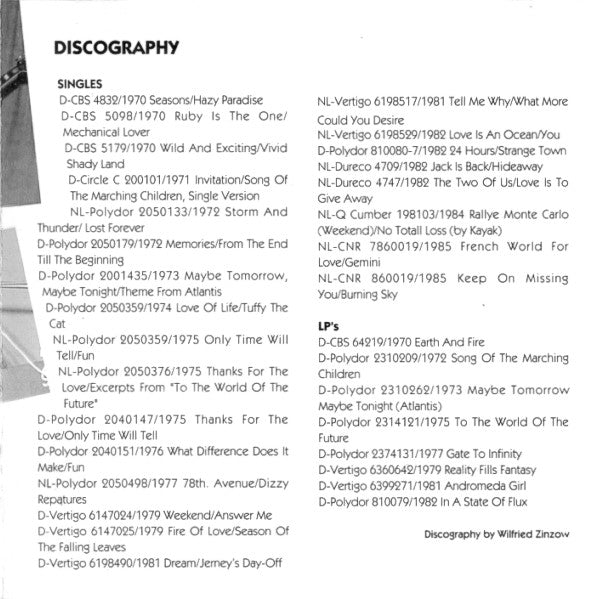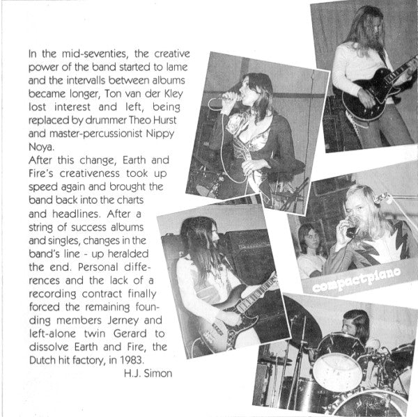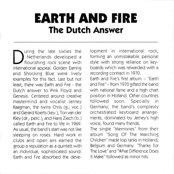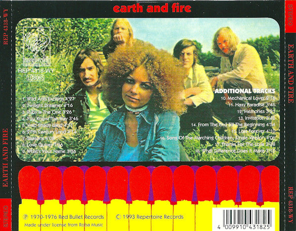 Tracks 1 to 9 originally released as the LP "Earth And Fire" in 1970. Tracks 10 to 18 are taken from singles (1970-1976): 10 originally released as single B-side CBS 5098 in 1970. 11 originally released as single B-side CBS 4832 in 1970. 12 originally released as single A-side Polydor 2050179 in 1972. 13 originally released as single A-side Circle C 200101 in 1971. 14 originally released as single B-side Polydor 2050179 in 1972. 15 originally released as single A-side Polydor 2050133 in 1971. 16 originally released as single B-side Circle C 200101 in 1971. 17 originally released as single A-side Polydor 2040147 in 1975. 18 originally released as single A-side Polydor 2040151 in 1976. Track 6 title is as credited as on the original LP release. ℗ 1970-1976 Red Bullet Records [on cover ℗ 1970-76 Red Bullet Records [on CD © 1993 Repertoire Records Made under license from Roba Music