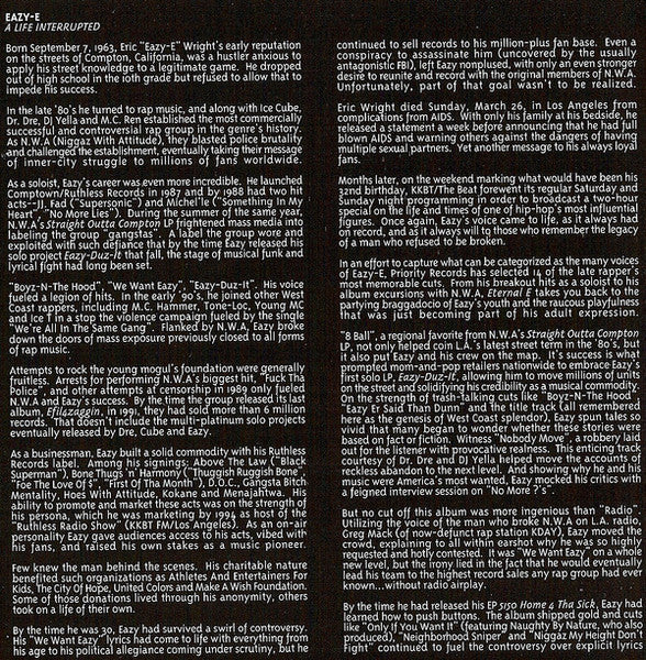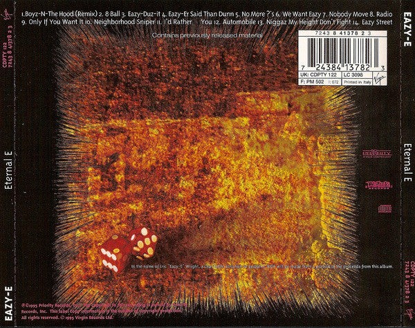 Contains previously released material. In the name of Eric "Eazy-E" Wright, a charitable donation to pediatric AIDS will be made from a portion of the proceeds from this album. UK: CDPTY 122 Printed in Italy