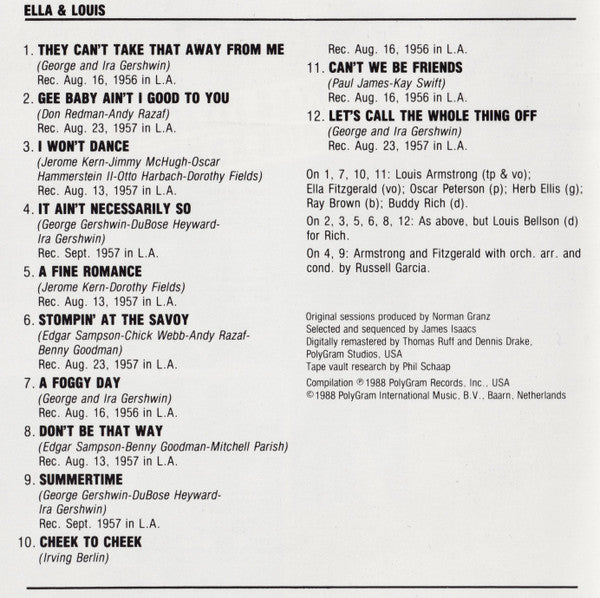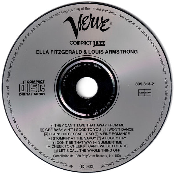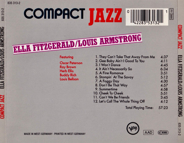 Total Playing Time: 57:23. Artist on the spine: Ella Fitzgerald/Louis Armstrong Made in West-Germany. Printed in West-Germany.