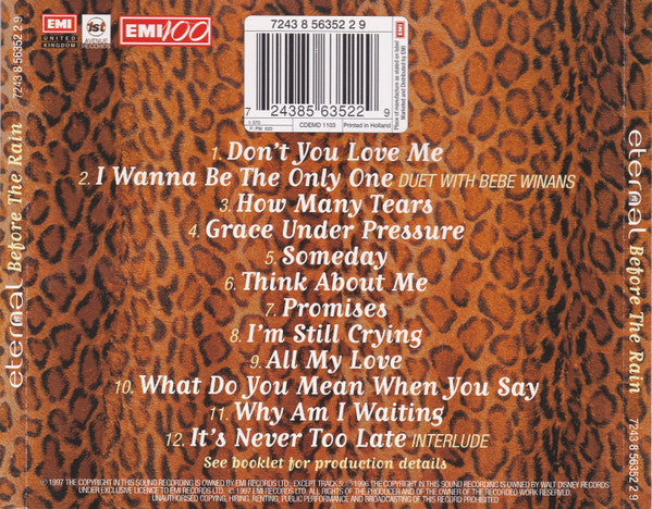 ℗ 1997 The copyright in this sound recording is owned by EMI Records Ltd., except track 5 ℗ 1996 the copyright in the sound recording is owned by Walt Disney Records under exclusive licence to EMI Records Ltd.. © 1997 EMI Records Ltd. "Printed in Holland" on back inlay. "Made in Holland" on disc. There's a similar release "Made in the UK" by EMI Swindon.