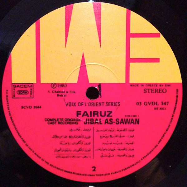 Complete Original Cast Recording Jabal As-Sawan Popular Musical Play by The Rahbani Brothers Live Recording Voix De L'Orient Series Produced by A. Chahine & Fils (P) 1980 A. Chahine & Fils. Beirut Made in Greece by EMI