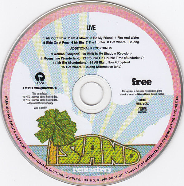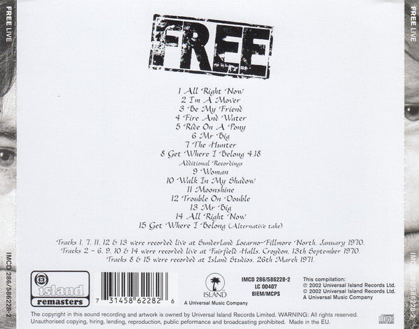 "Digitally remastered original album by FREE expanded with rare & unissued tracks" on black round sticker on cover. Tracks 1, 7, 11, 12 & 13 were recorded live at Sunderland Locarno-Fillmore North, January 1970. Tracks 2 - 6, 9, 10 & 14 were recorded live at Fairfield Halls, Croydon, 13th September 1970. Tracks 8 & 15 were recorded at Island Studios, 26th March 1971. Track 12 misspelled as Trouble On Double on cover (Trouble On Double Time on disc and inner booklet). Duration indicated in track 8 only.