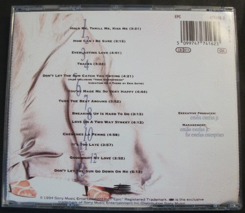 CD 2560 On CD Face. Price code CB 811 and format code CDC. [r=10869856 has price code CB 701 and format code CDM. Track 05 includes "Trois Gymnopédies" variation on a theme by Erik Satie. Track 07 was featured on the soundtrack from the Motion Picture "THE SPECIALIST" Track 13 is an "International Bonus Track" ℗ 1994 Sony Music Entertainment Inc. © 1994 Sony Music Entertainment Inc. some copies in Spanish distributed countries contain a sticker stating "ANUNCIADO EN TV 42-477416-10". some sopies contain a sticker stating "European version includes 1 bonus track plus the smash single Turn The Beat Around, Everlasting Love and Hold Me, Thrill Me, Kiss Me 01-477416-10".