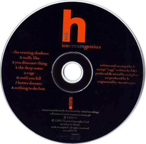 Steve Hogarth's debut solo album, with all-star band. Ice Cream Genius was released in North America in August 1998 with different artwork and the extra track 'The Last Thing'. Standard jewel case with clear tray including 12 pages booklet (lyrics, album credits, musicians, thanks & tracklisting), see images section. [Recording details This record was dreamt up at home and away and was recorded at Brisbane House, The Racket Club, Sol Mill, The Woolhall. ℗ 1997 h © 1997 Castle Copyrights Ltd Made in England