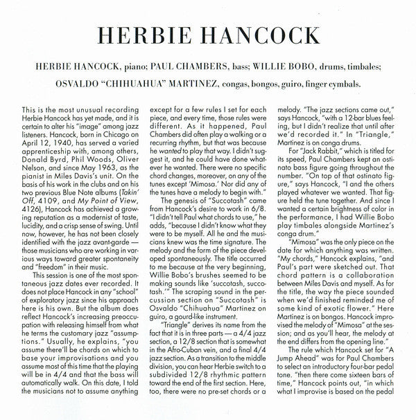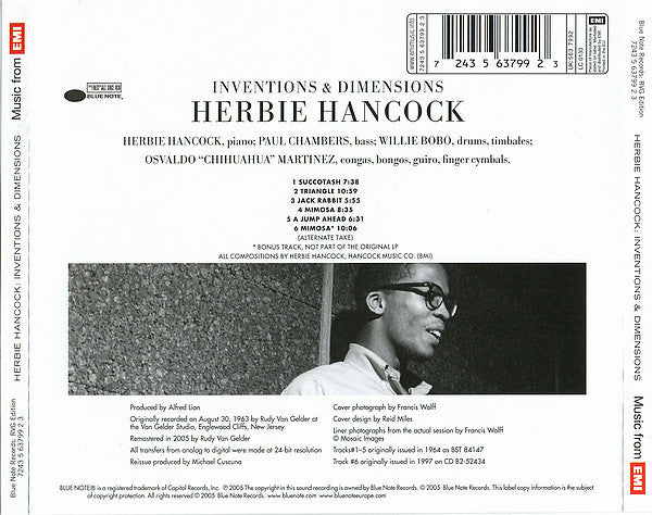 ℗© 2005 Blue Note Records Made and Printed in the EU. Track 6 is a bonus track, not part of the original LP. Liner photographs from the actual session by Francis Wolff © Mosaic Images. Originally recorded on August 30, 1963 by Rudy Van Gelder at the Van Gelder Studio, Englewood Cliffs, New Jersey. Remastered in 2005 by Rudy Van Gelder All transfers from analog to digital were made at 24-bit resolution Tracks #1-5 originally issued in 1964 as BST 84148 Track #6 originally issued in 1997 on CD B2-52434