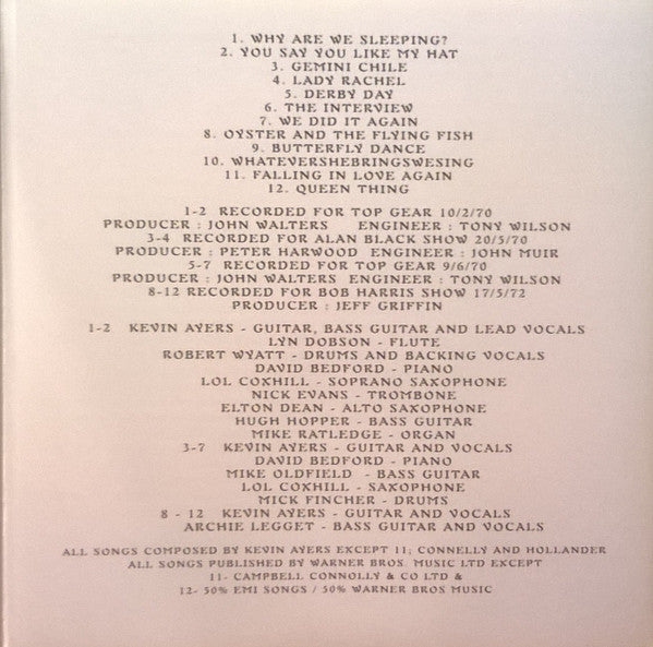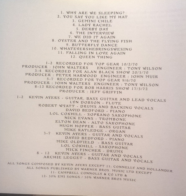 Tracks 1, 2: recorded for Top Gear 10/2/70 Tracks 3, 4: recorded for Alan Black Show 20//5/70 Tracks 5 to 7: recorded for Top Gear 9/6/70 Tracks 8 to 12: recorded for Bob Harris Show 17/5/72 All songs published by Warner Bros. Music Ltd. except 11: Campbell Connolly & Co Ltd and 12: 50% EMI Songs / 50% Warner Bros. Music By arrangement with BBC Worldwide Music ℗ 1998 BBC Worldwide Music © BBC 1970-72 © 1998 Strange Fruit Ltd.