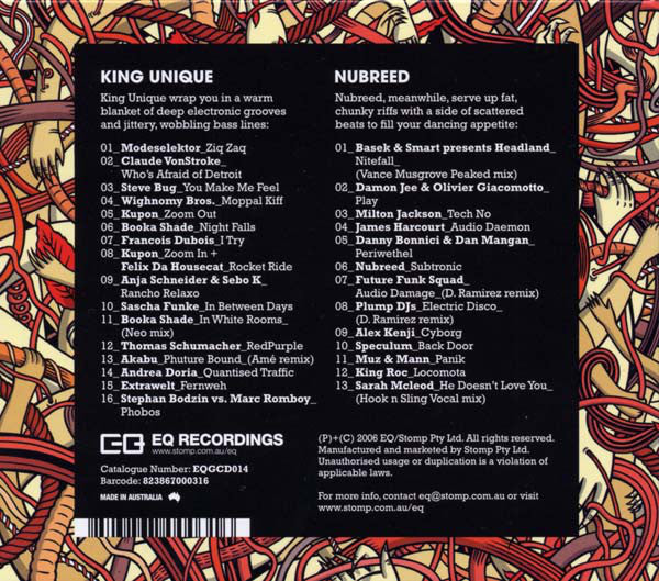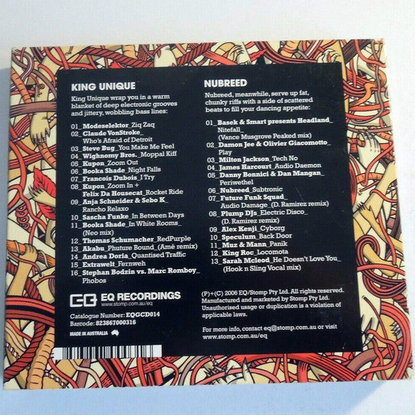 Comes as gatefold digipak (P)+(C) 2006 EQ/Stomp Pty Ltd. Manufactured and marketed by Stomp Pty Ltd. Mastered @ Deluxe Mastering Art direction and design @ EQ/Stomp Technical and imaging support @ EQ/Stomp Made in Australia CD 1: King Unique wrap you in a warm blanket of deep electronic grooves and jittery, wobbling bass lines. CD 2: Nubreed, meanwhile, serve up fat, chunky riffs with a side of scattered beats to fill your dancing appetite. Track 1-13 remix name is listed as "Amé Remix" on the cover and as "Amé Mix" in the booklet. Track 1-16 artist is listed as "Stephan Bodzin vs. Marc Romboy" on the cover and as "Stephan Bodzin vs Marc Romboy" in the booklet. Track 2-07 remix name is listed as "D. Ramirez Remix" on the cover and as "D. Ramirez Mix" in the booklet. Track 2-08 remix name is listed as "D. Ramirez Remix" on the cover and as "D. Ramirez Mix" in the booklet.